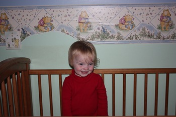 One day last week I went in to get my youngest daughter from her crib after her nap. I had heard her babbling in there for quite a while. Turns our she has now reached our unofficial family milestone.