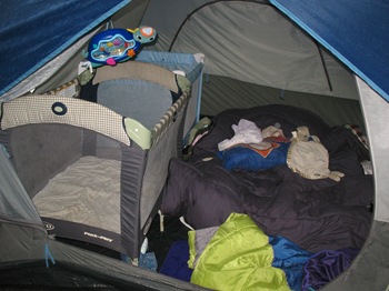 When we camp with small infants, we tend to let them sleep in their infant seats. It keeps them warm and snug and they tend to sleep better.