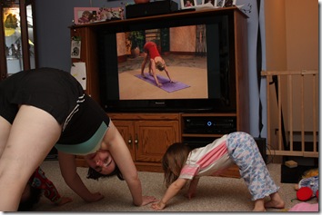 Monday was day one and it called for strength and stretch. So, I got out a DVD and did some yoga and ballet. This of course looked like a ton of fun to the kiddos, so they joined me. It was the most fun I have had stretching, ever!