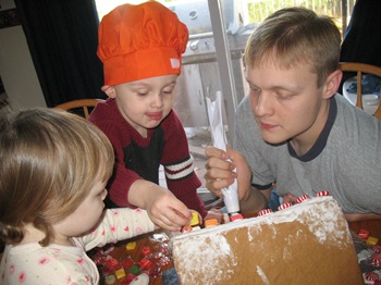He quickly caught on that one of the best parts of decorating gingerbread houses is eating the decorations. :-)
