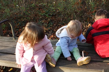 I sat the kids down on a bench at one of the “exercise stops” on the walking path. You were supposed to do sit ups here. My son saw the curved bar and thought he knew what to do. Before I could even think about stopping him, he had flipped over the bar and landed hard on his poor little noggin. But, I had just set the girls down for the phot opp at the same instant and I knew time was of the essence.