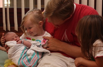 He wasn’t the only one instantly smitten though. The girls were truly taken by their baby brother. They wanted to touch his toes, and count his fingers.