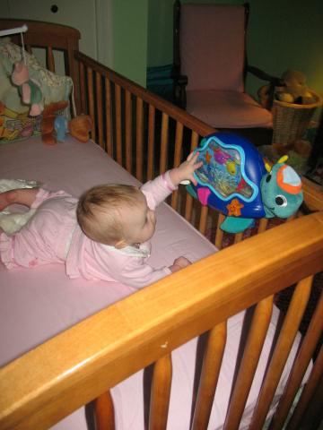 I always played a cd of lullaby music for my other two kids as they fell asleep. This can sometimes be a pain when we are away from home, especially camping, and we don’t have access to a cd player. With the baby we lay her down in her crib, push play on Mr Turtle, and it plays a little song for approx 15-20 seconds. If she wants more music she hits it once or twice more. It is portable, so we have brought it with us camping or on other over night trips. It’s easy for her to use so if she wakes up in the morning and can’t fall back asleep she can push the button herself. (Doesn’t need Mom to get out of bed and come hit play on the cd player). This fact alone makes it worth the $20 we spent on the toy. I often hear the music playing in her room before it’s time for her to wake up. (Now that the crib is lowered and Mr Turtle rests on on the bottom, she sometimes rolls into it while sleeping and once we heard it playing continuously because her head was against it. Didn’t seem to bother her a bit though).