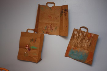 I cut the bag open much like you do when making book covers and gave each kid one half of a brown bag to draw on. They were so excited at the big space to draw in. And they loved the fact that white crayon showed up on brown paper. Equally exciting was the fact that it had a handle for hanging.